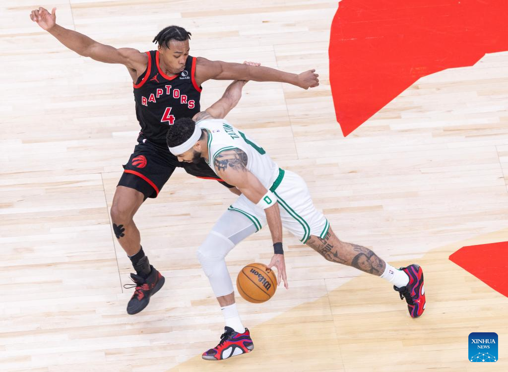 Jayson Tatum (R) of Boston Celtics breaks through against Scottie Barnes of Toronto Raptors during the 2024-2025 NBA regular season game between Toronto Raptors and Boston Celtics in Toronto, Canada, on Feb. 25, 2025. (Photo by Zou Zheng/Xinhua)