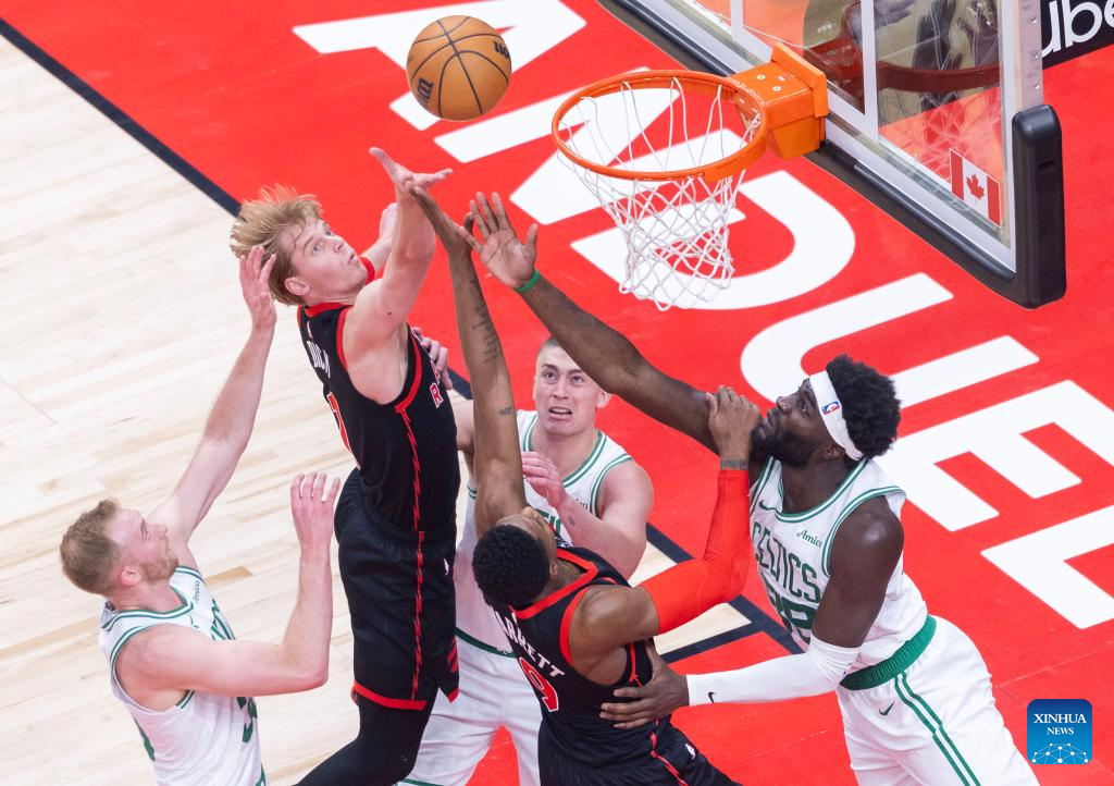 Gradey Dick (2nd L) of Toronto Raptors fights for a rebound with Neemias Queta (1st R) of Boston Celtics during the 2024-2025 NBA regular season game between Toronto Raptors and Boston Celtics in Toronto, Canada, on Feb. 25, 2025. (Photo by Zou Zheng/Xinhua)