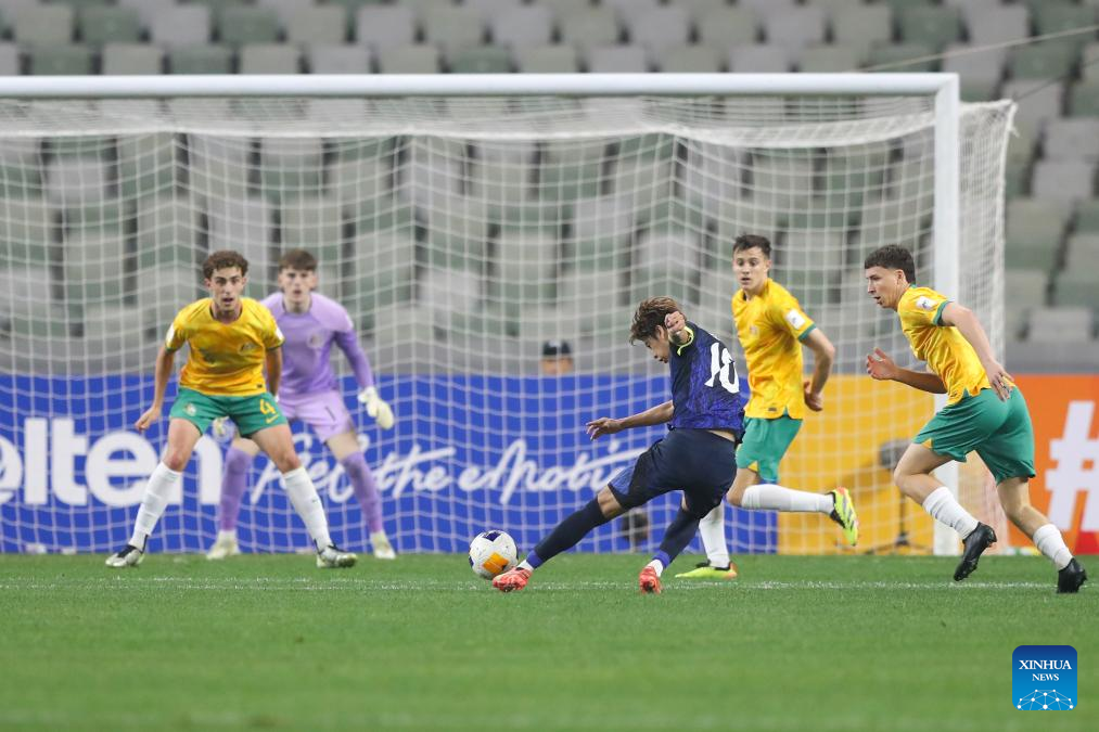 Rento Takaoka (3rd R) of Japan shoots during the semifinal match between Australia and Japan at the AFC U20 Asian Cup football tournament in Shenzhen, south China's Guangdong Province, Feb. 26, 2025. (Xinhua/Li Xulun)