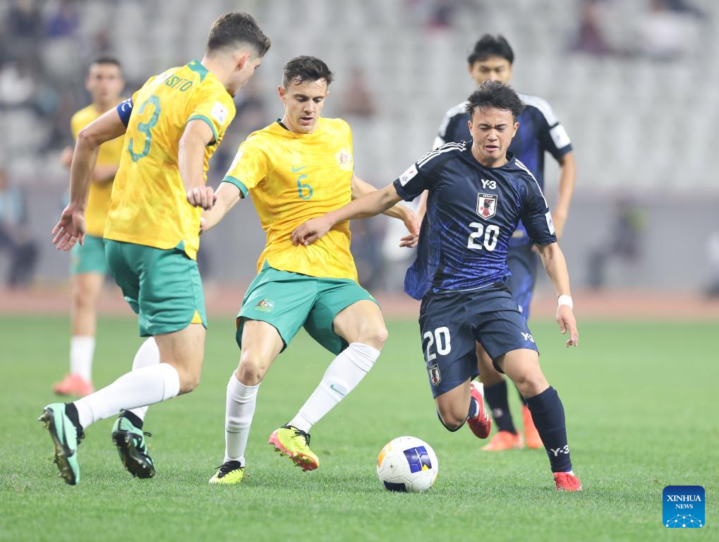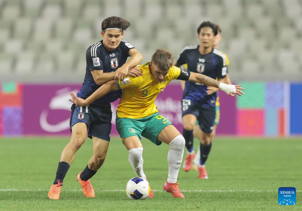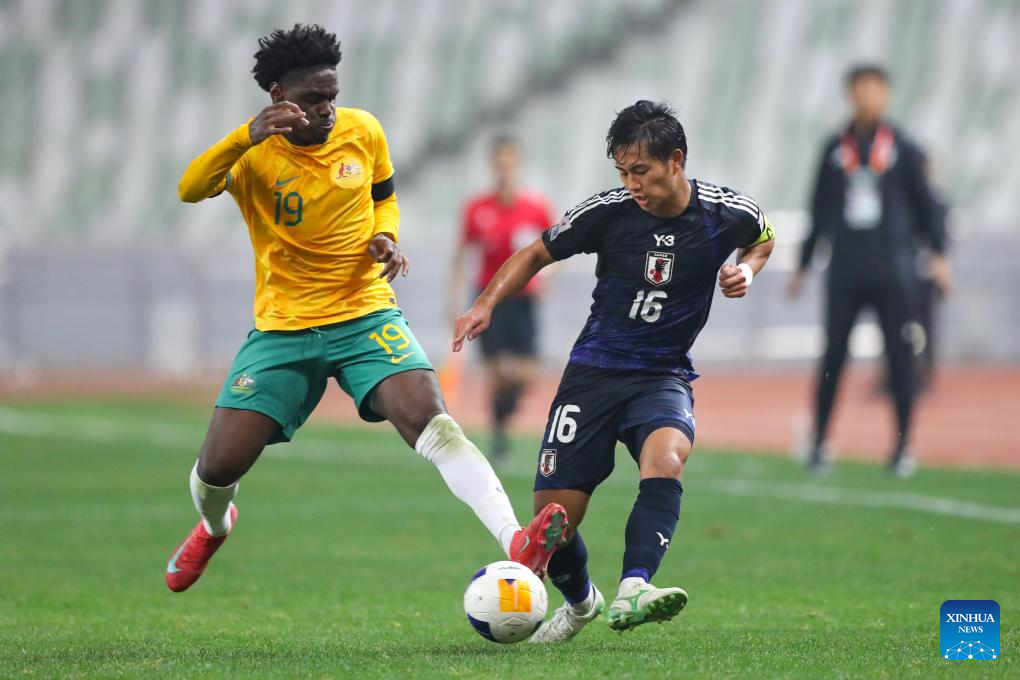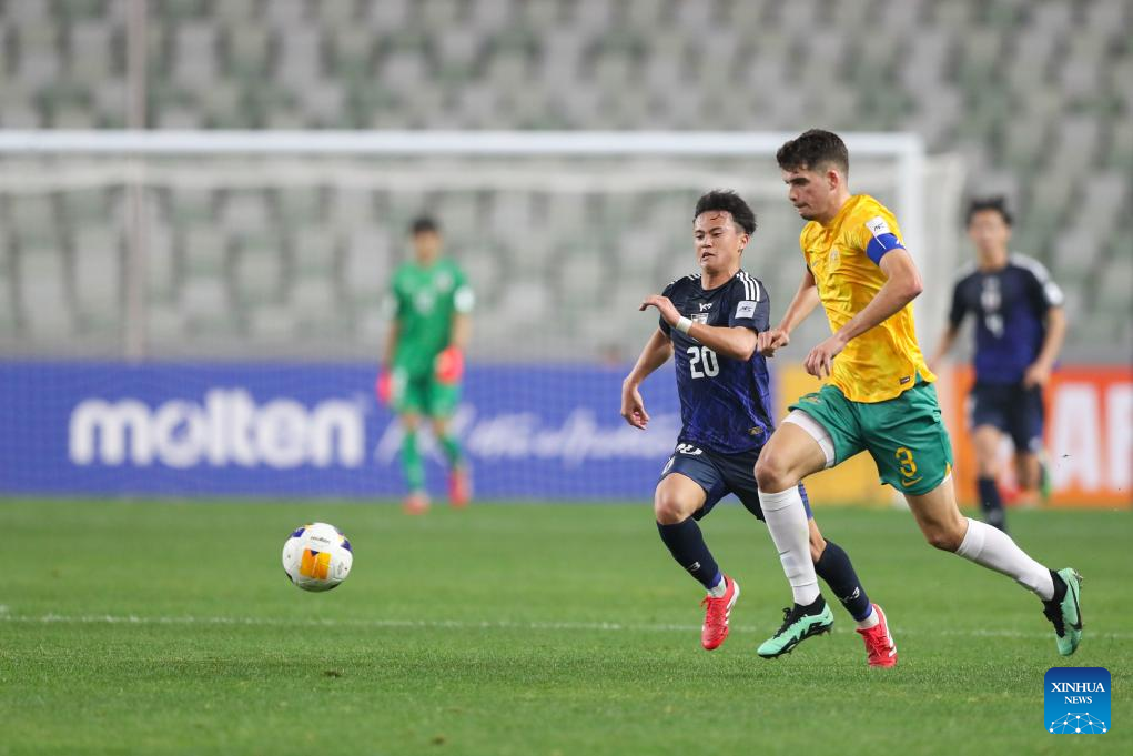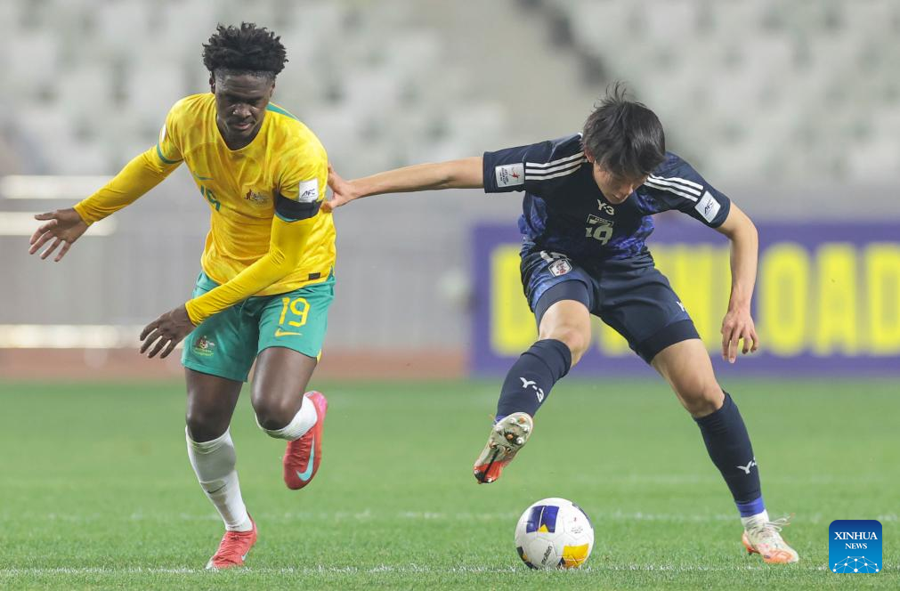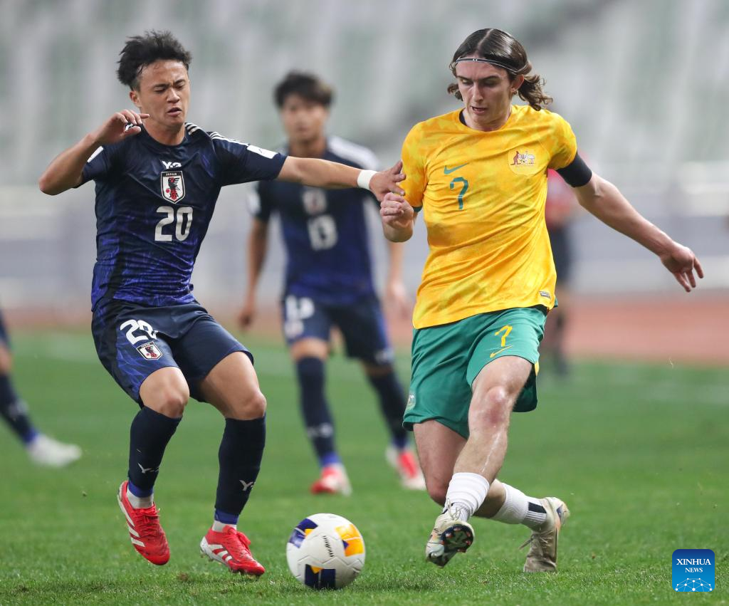 Tsuchiya Kaito (R) of Japan breaks through during the semifinal match between Australia and Japan at the AFC U20 Asian Cup football tournament in Shenzhen, south China's Guangdong Province, Feb. 26, 2025. (Xinhua/Lu Hanxin)