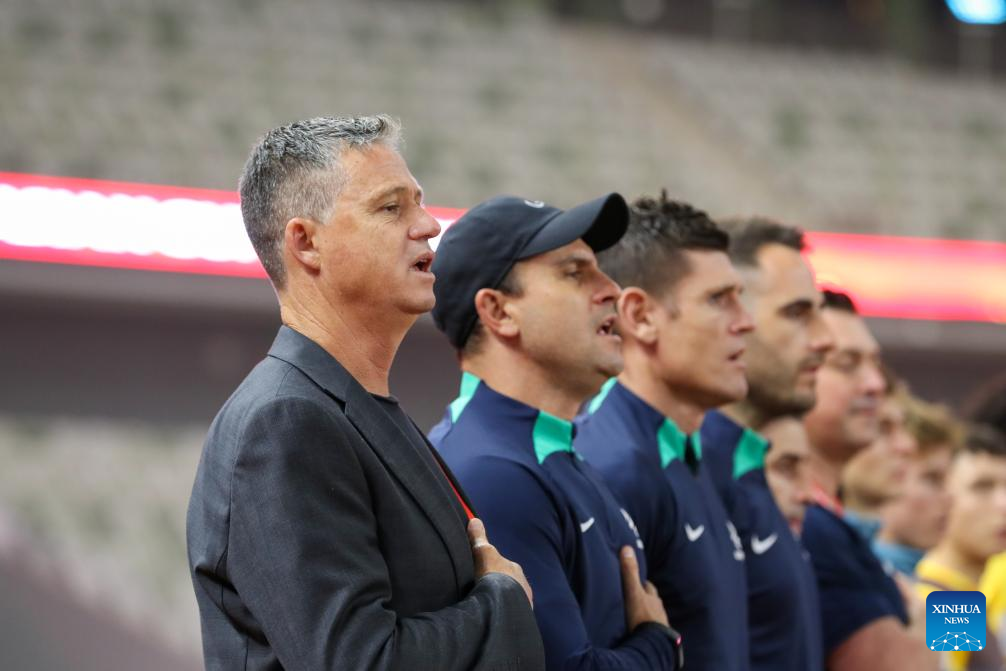 Trevor James Morgan (1st L), head coach of Australia, reacts before the semifinal match between Australia and Japan at the AFC U20 Asian Cup football tournament in Shenzhen, south China's Guangdong Province, Feb. 26, 2025. (Xinhua/Li Xulun)