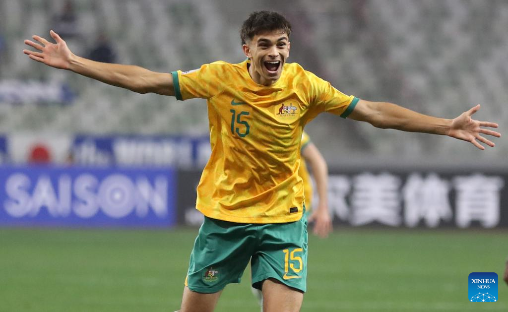 Jaylan Pearman of Australia celebrates scoring during the semifinal match between Australia and Japan at the AFC U20 Asian Cup football tournament in Shenzhen, south China's Guangdong Province, Feb. 26, 2025. (Xinhua/Li Xulun)