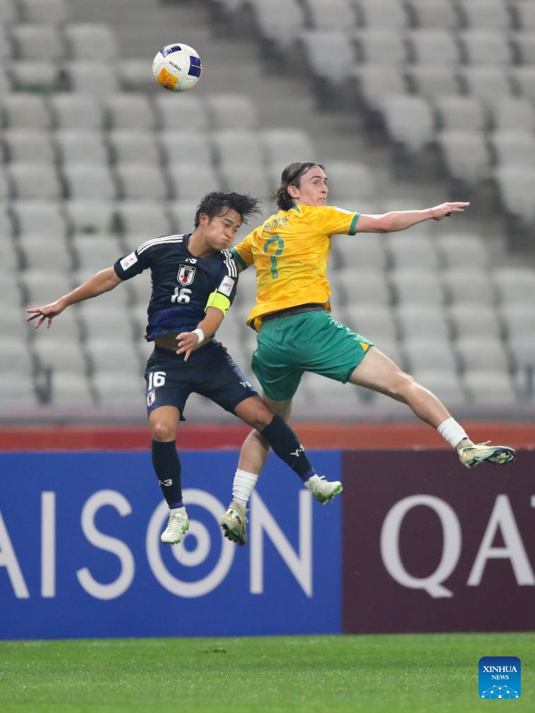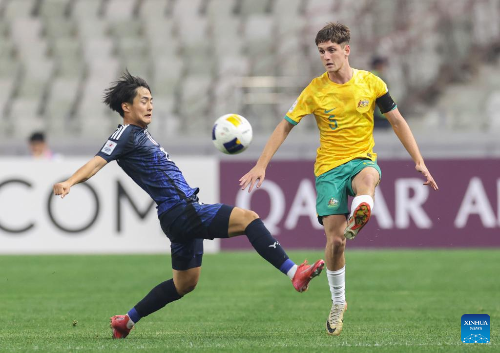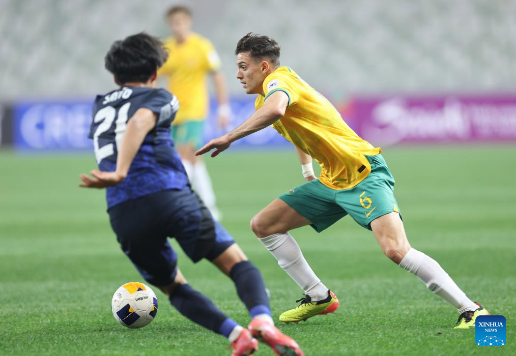 Daniel Bennie (R) of Australia vies with Rikuto Kuwahara of Japan during the semifinal match between Australia and Japan at the AFC U20 Asian Cup football tournament in Shenzhen, south China's Guangdong Province, Feb. 26, 2025. (Xinhua/Li Xulun)