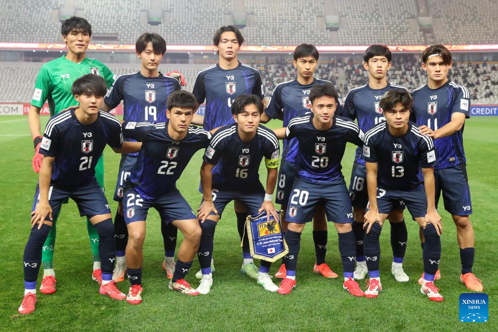 Players of Japan pose for a photo before the semifinal match between Australia and Japan at the AFC U20 Asian Cup football tournament in Shenzhen, south China's Guangdong Province, Feb. 26, 2025. (Xinhua/Li Xulun)