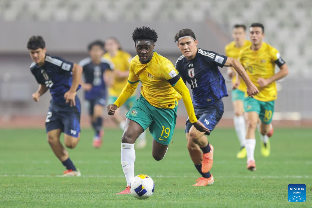 Musa Toure (C) of Australia breaks through during the semifinal match between Australia and Japan at the AFC U20 Asian Cup football tournament in Shenzhen, south China's Guangdong Province, Feb. 26, 2025. (Xinhua/Lu Hanxin)