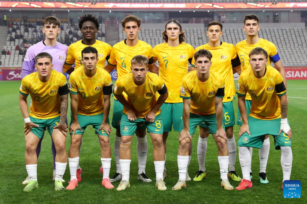 Players of Australia pose for a photo before the semifinal match between Australia and Japan at the AFC U20 Asian Cup football tournament in Shenzhen, south China's Guangdong Province, Feb. 26, 2025. (Xinhua/Li Xulun)