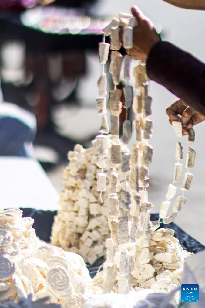 A vendor sells dairy products at a local market in Lhasa, southwest China's Xizang Autonomous Region, Feb. 25, 2025. People in Lhasa are busy with making preparations ahead of the upcoming Tibetan New Year. (Xinhua/Jiang Fan)