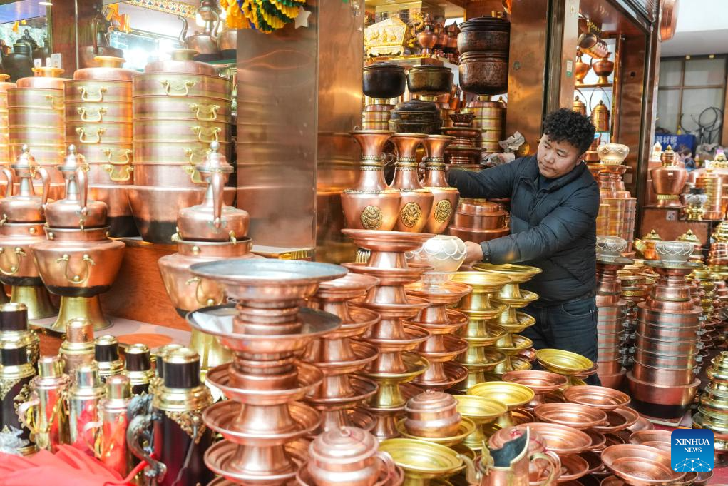 A vendor arranges goods at a local market in Lhasa, southwest China's Xizang Autonomous Region, Feb. 24, 2025. People in Lhasa are busy with making preparations ahead of the upcoming Tibetan New Year. (Xinhua/Jigme Dorje)