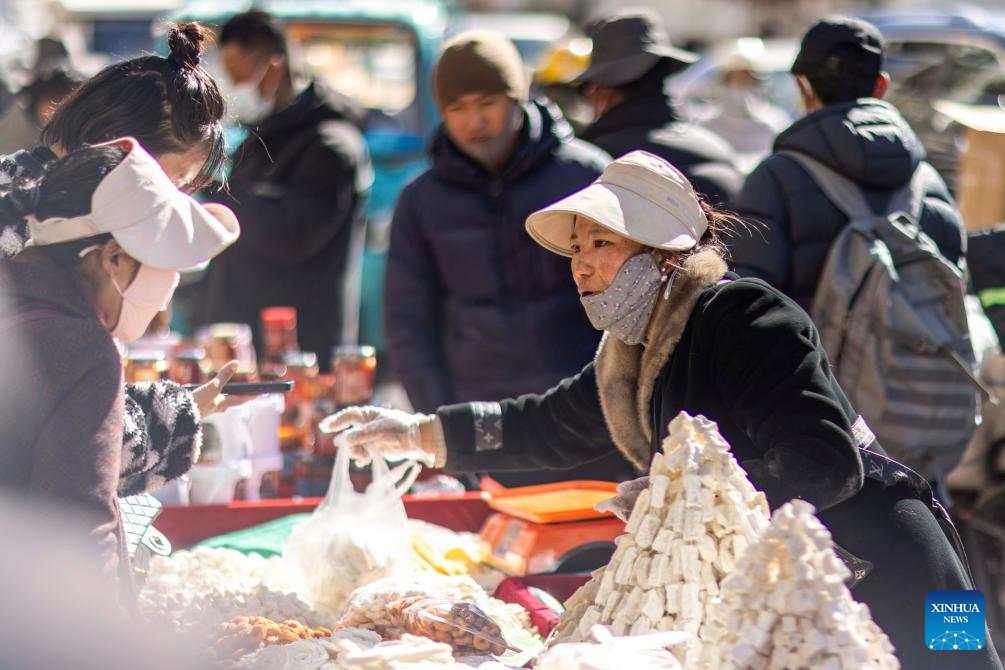 Customers buy dairy products at a local market in Lhasa, southwest China's Xizang Autonomous Region, Feb. 25, 2025. People in Lhasa are busy with making preparations ahead of the upcoming Tibetan New Year. (Xinhua/Jiang Fan)