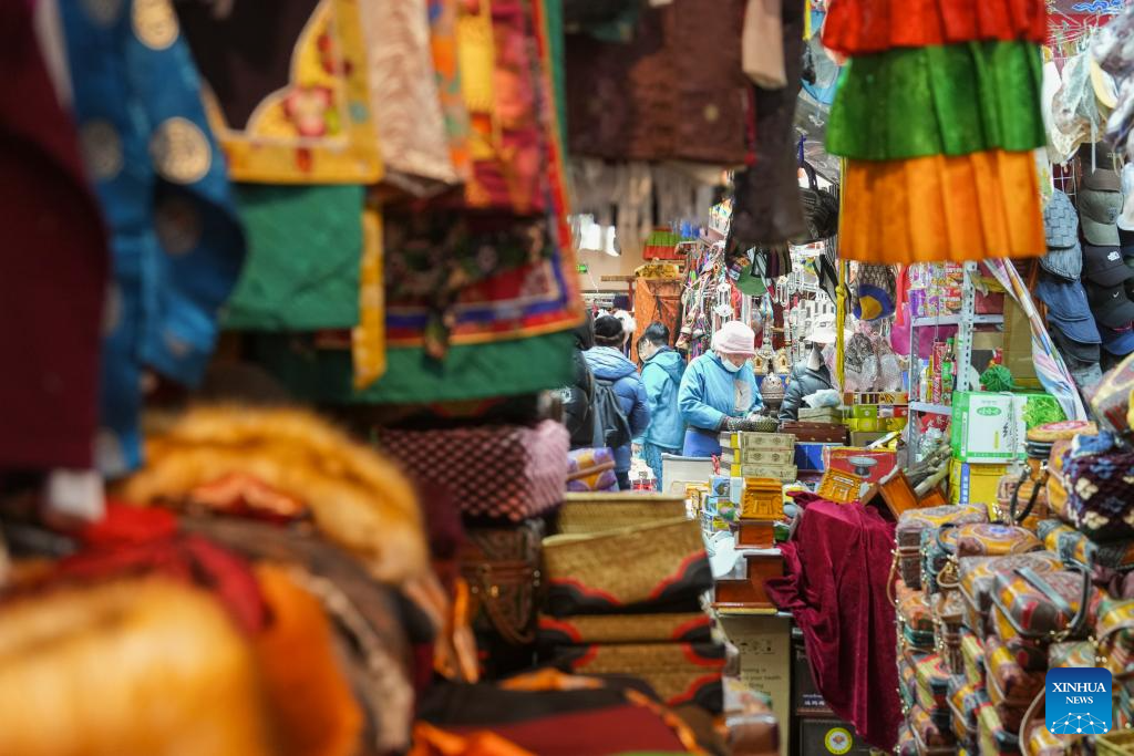 Vendors arrange goods at a local market in Lhasa, southwest China's Xizang Autonomous Region, Feb. 24, 2025. People in Lhasa are busy with making preparations ahead of the upcoming Tibetan New Year. (Xinhua/Jigme Dorje)