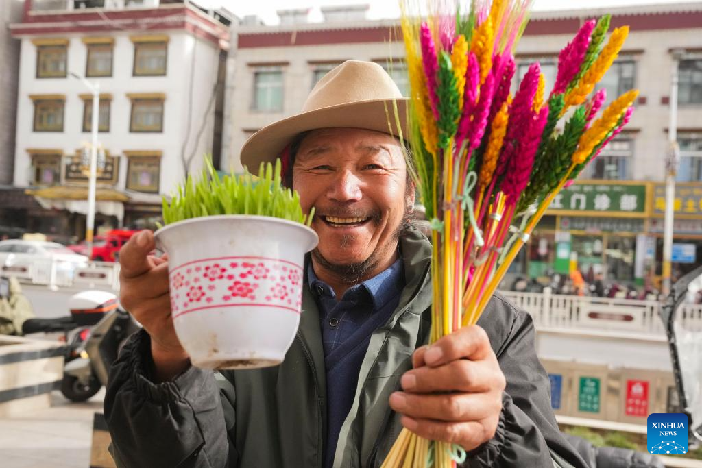 A vendor displays highland barley seedlings and new-year decorations in Lhasa, southwest China's Xizang Autonomous Region, Feb. 24, 2025. People in Lhasa are busy with making preparations ahead of the upcoming Tibetan New Year. (Xinhua/Jigme Dorje)