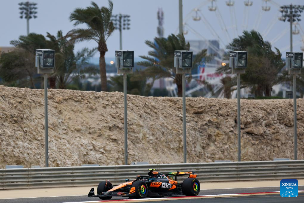 McLaren's driver Lando Norris of Britain drives during the F1 pre-season testing at the Bahrain International Circuit in Sakhir, Bahrain, Feb. 26, 2025. (Photo by Qian Jun/Xinhua)