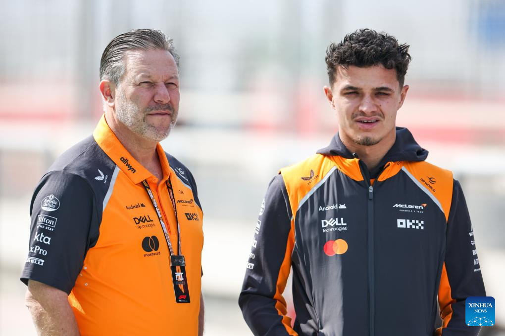 Zak Brown(L), CEO of McLaren Racing talks with team's British driver Lando Norris during the F1 pre-season testing at the Bahrain International Circuit in Sakhir, Bahrain, Feb. 26, 2025. (Photo by Qian Jun/Xinhua)