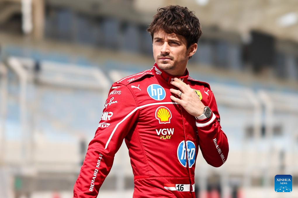 Ferrari's driver Charles Leclerc of Monaco reacts before the F1 pre-season testing at the Bahrain International Circuit in Sakhir, Bahrain, Feb. 26, 2025. (Photo by Qian Jun/Xinhua)