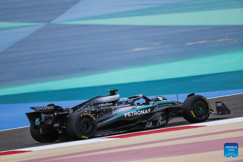 Mercedes' drvier George Russell of Britain drives during the F1 pre-season testing at the Bahrain International Circuit in Sakhir, Bahrain, Feb. 26, 2025. (Photo by Qian Jun/Xinhua)