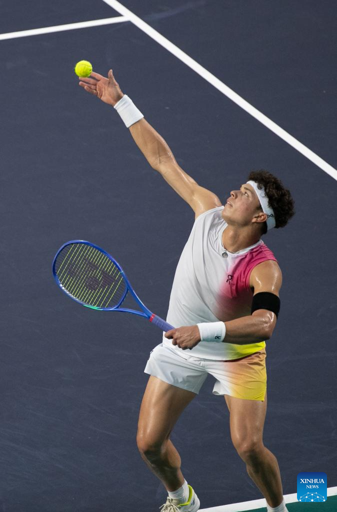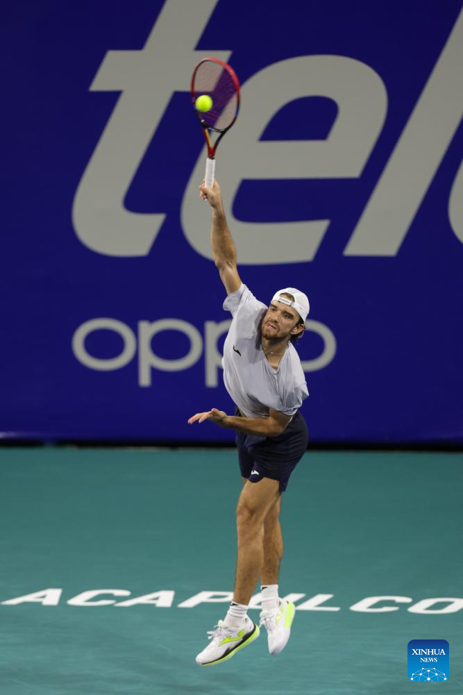 Ben Shelton of the United States serves during the men's singles round of 16 match against David Goffin of Belgium at the 2025 ATP Mexican Open tennis tournament in Acapulco, Mexico, Feb. 26, 2025. (Xinhua/Li Mengxin)