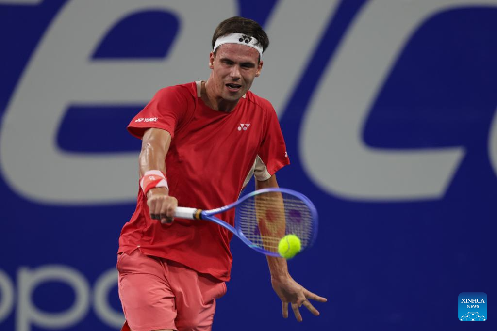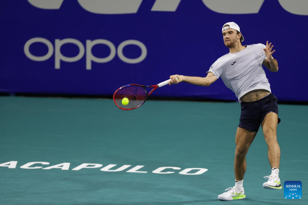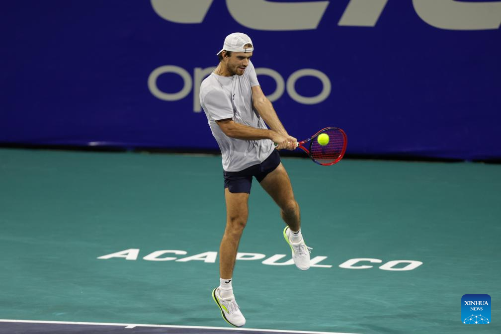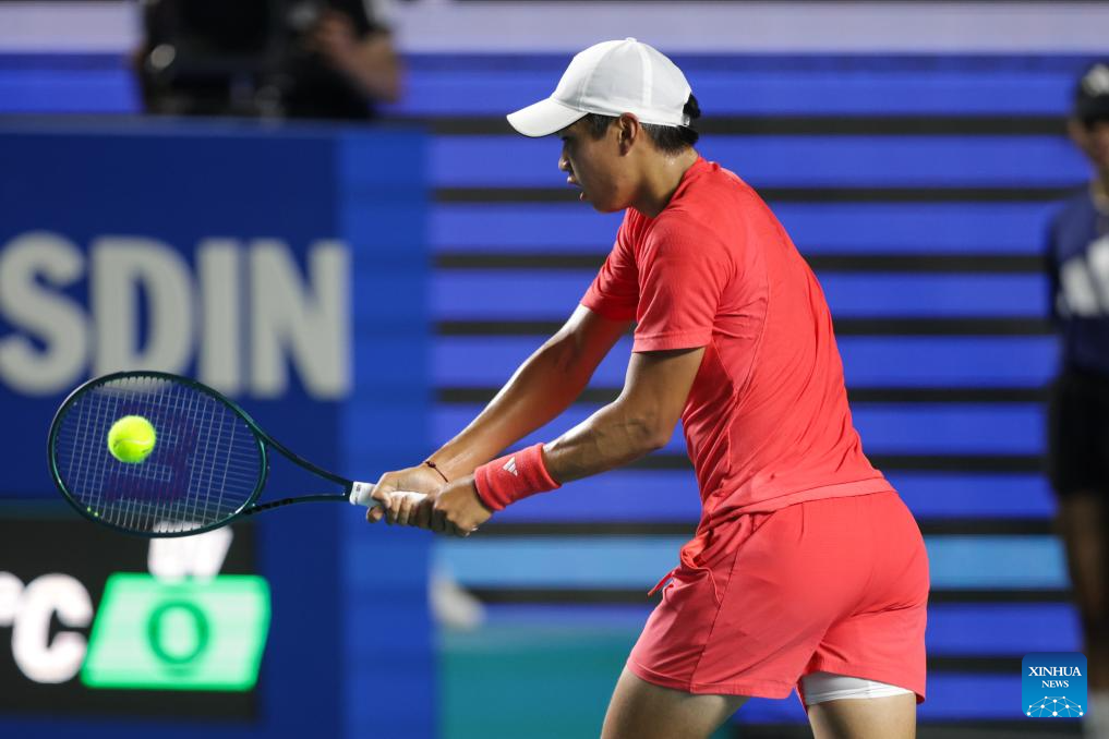 Tomas Machac of the Czech Republic hits a return during the men's singles round of 16 match against Daniel Altmaier of Germany at the 2025 ATP Mexican Open tennis tournament in Acapulco, Mexico, Feb. 26, 2025. (Photo by Francisco Canedo/Xinhua)