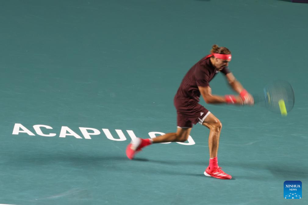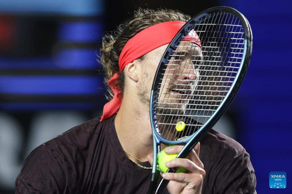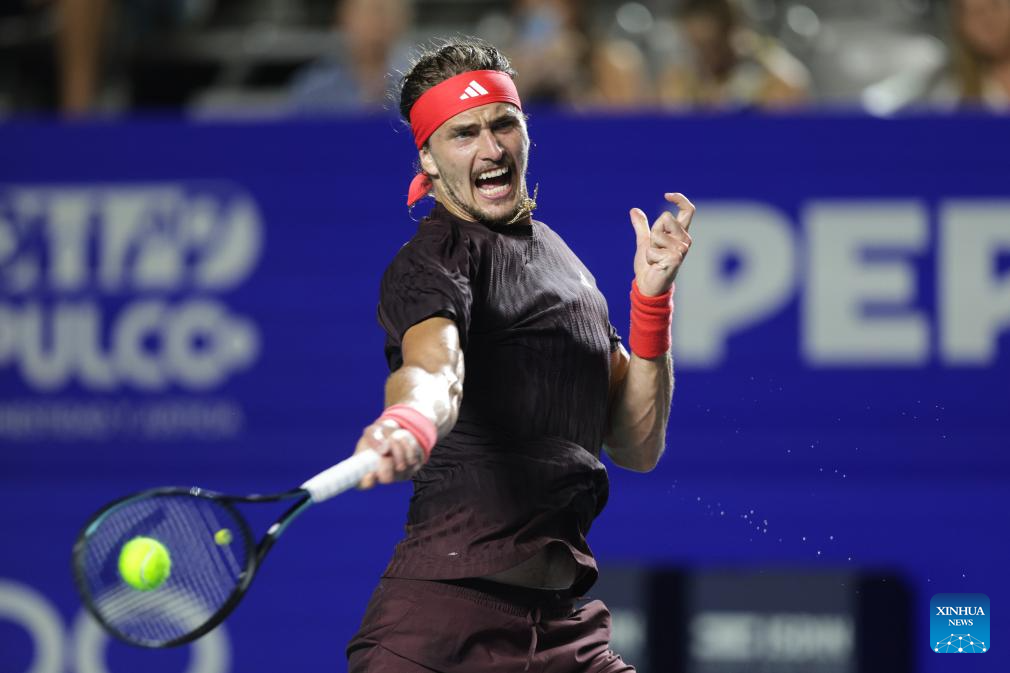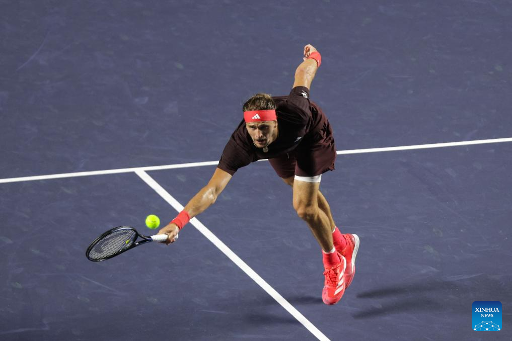 Alexander Zverev of Germany hits a return during the men's singles round of 16 match against Learner Tien of the United States at the 2025 ATP Mexican Open tennis tournament in Acapulco, Mexico, Feb. 26, 2025. (Photo by Francisco Canedo/Xinhua)