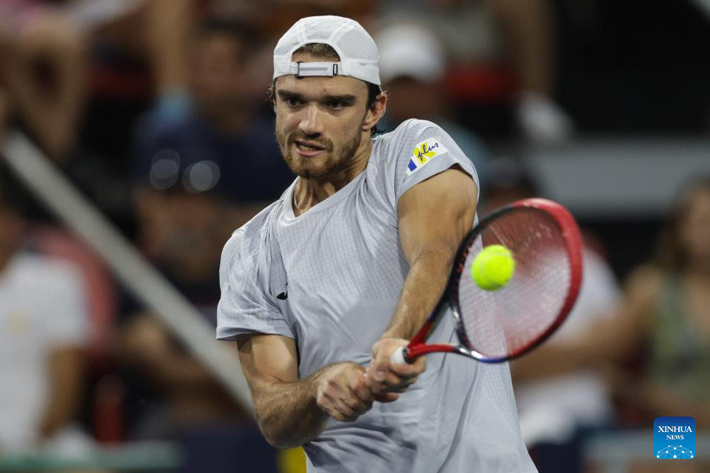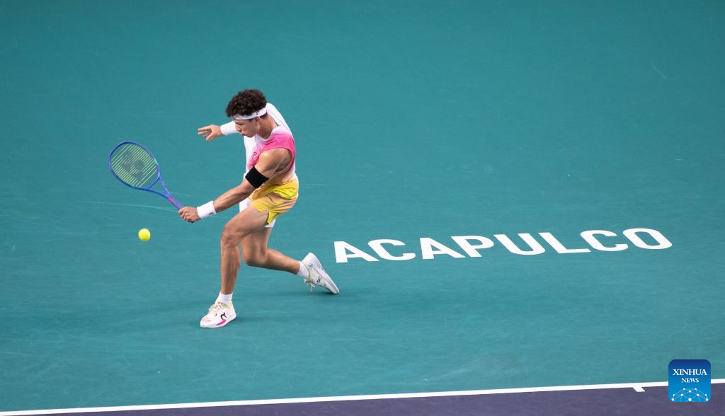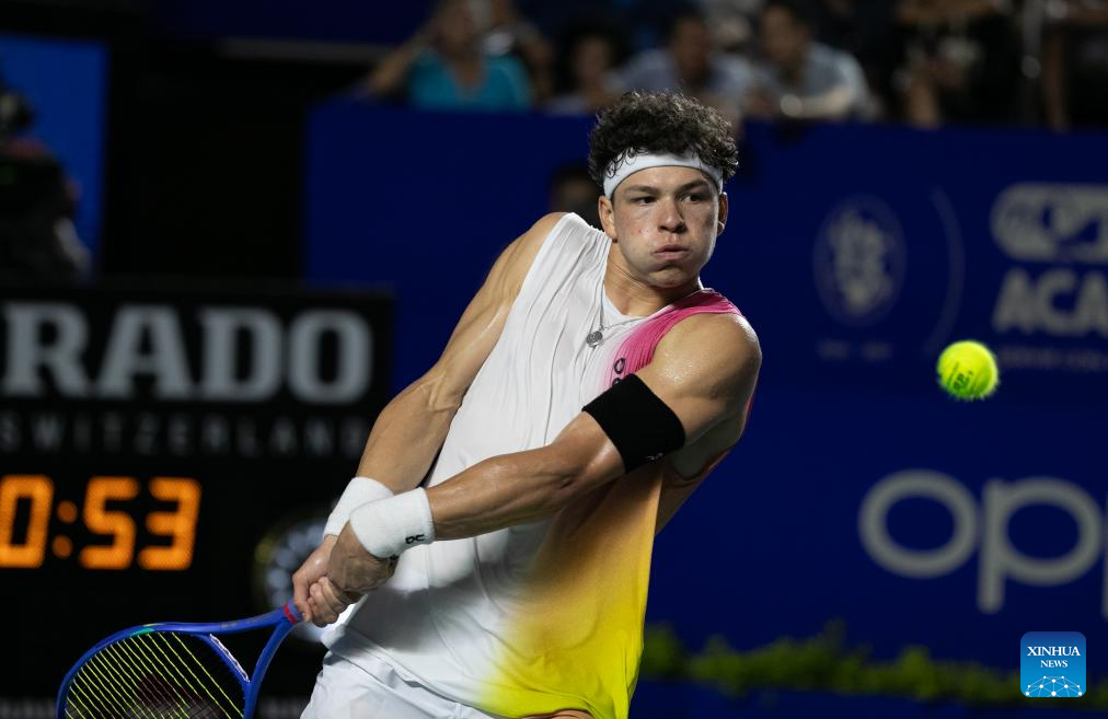 Ben Shelton of the United States hits a return during the men's singles round of 16 match against David Goffin of Belgium at the 2025 ATP Mexican Open tennis tournament in Acapulco, Mexico, Feb. 26, 2025. (Xinhua/Li Mengxin)