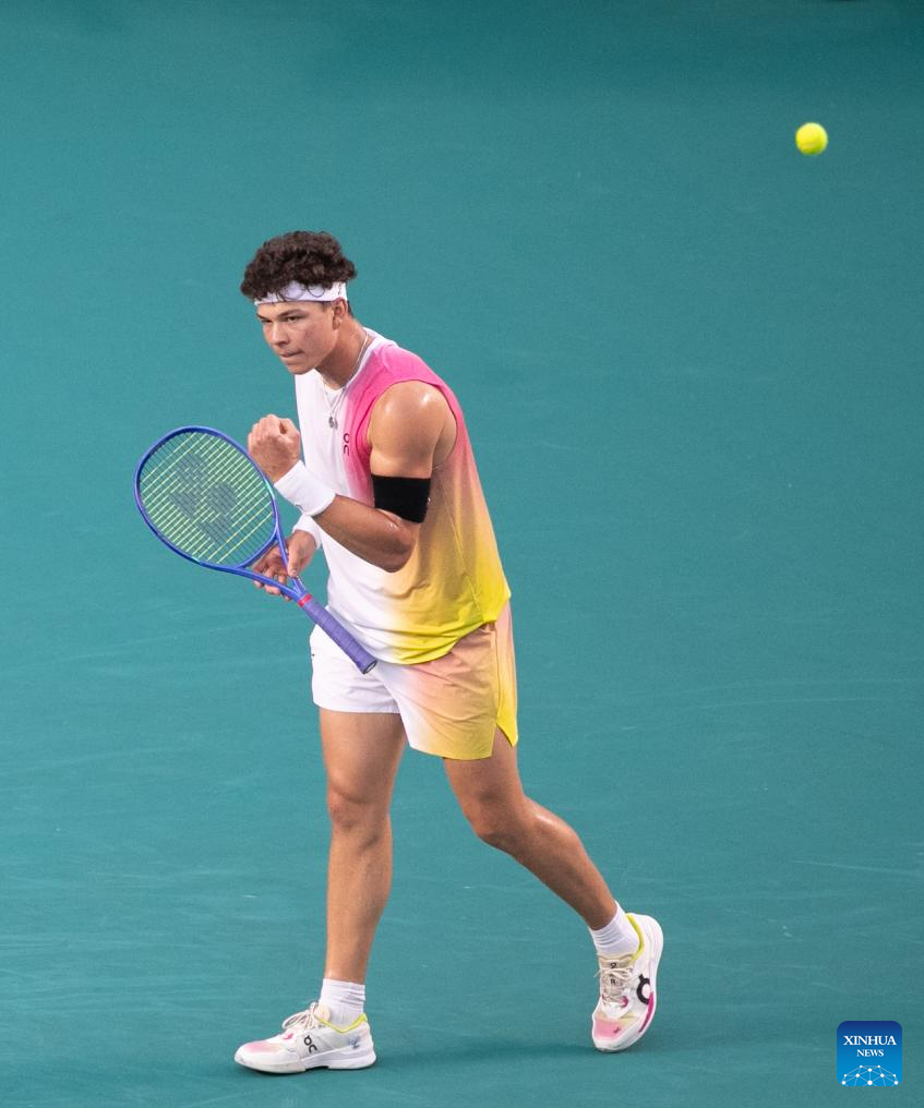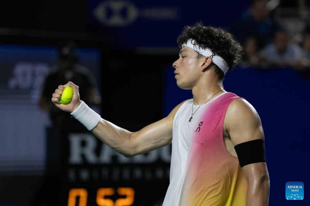 Ben Shelton of the United States celebrates scoring during the men's singles round of 16 match against David Goffin of Belgium at the 2025 ATP Mexican Open tennis tournament in Acapulco, Mexico, Feb. 26, 2025. (Xinhua/Li Mengxin)