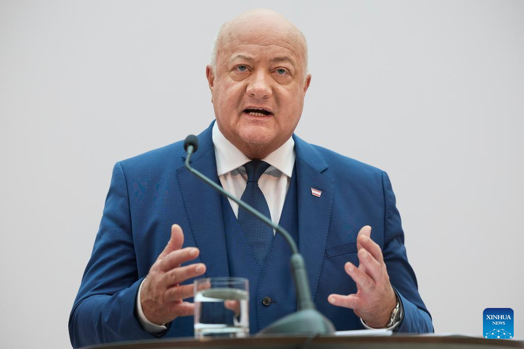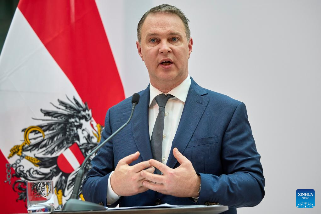 Austrian People's Party leader Christian Stocker speaks at a press conference in Vienna, Austria, Feb. 27, 2025. The Austrian People's Party, the Social Democratic Party and the NEOS party have agreed to form a coalition government without the far-right Freedom Party, it is reported Thursday. (Photo by Georges Schneider/Xinhua)