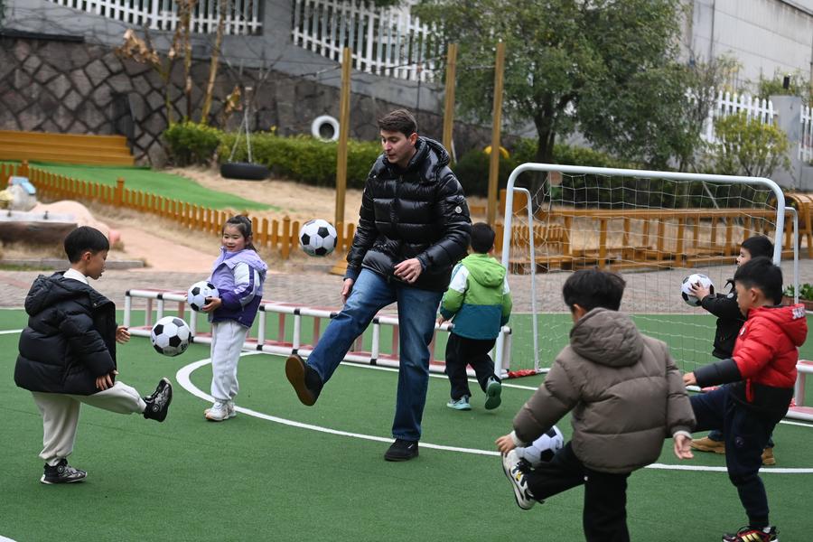 Iaroslav Lysenko (R) gives an English lesson to a child at a kindergarten in Jiangshan, east China's Zhejiang Province, Feb. 18, 2025. (Xinhua/Huang Zongzhi)Iaroslav Lysenko (C) plays football with children at a kindergarten in Jiangshan, east China's Zhejiang Province, Feb. 18, 2025. (Xinhua/Huang Zongzhi)
