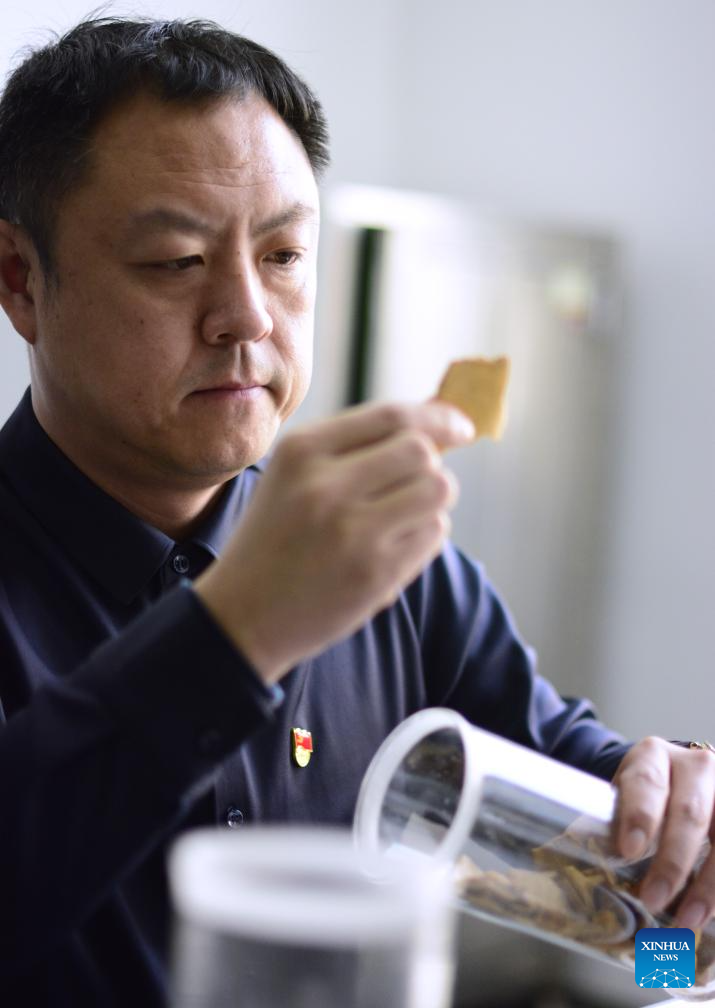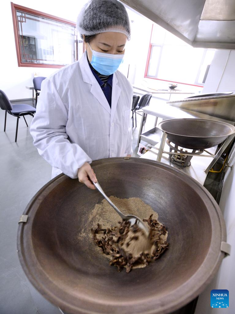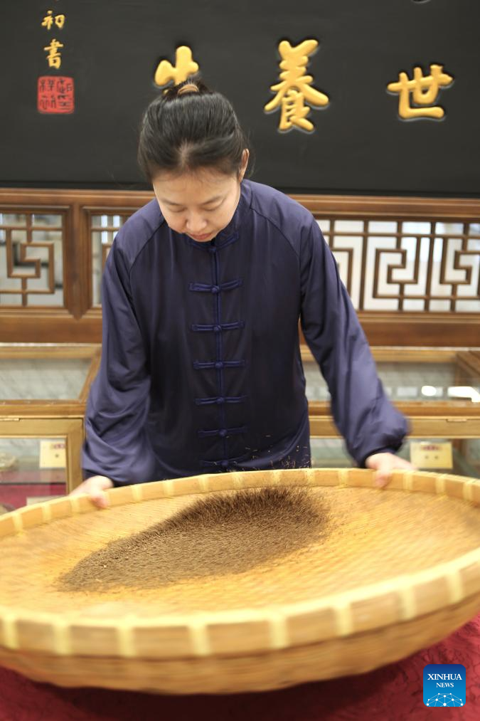 Lyu Jianyuan, an expert for Chinese medicine processing of Tong Ren Tang, shows how to process medicine at a protective production base of Tong Ten Tang in Beijing, capital of China, Feb. 23, 2025. (Xinhua/Li Xin)