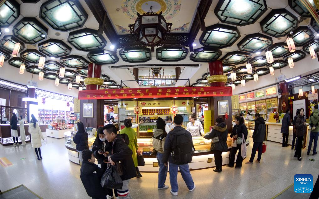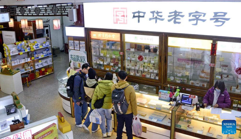 Customers select Chinese medicine at the store of Tong Ren Tang in Qianmen of Beijing, capital of China, Feb. 25, 2025. (Xinhua/Li Xin)