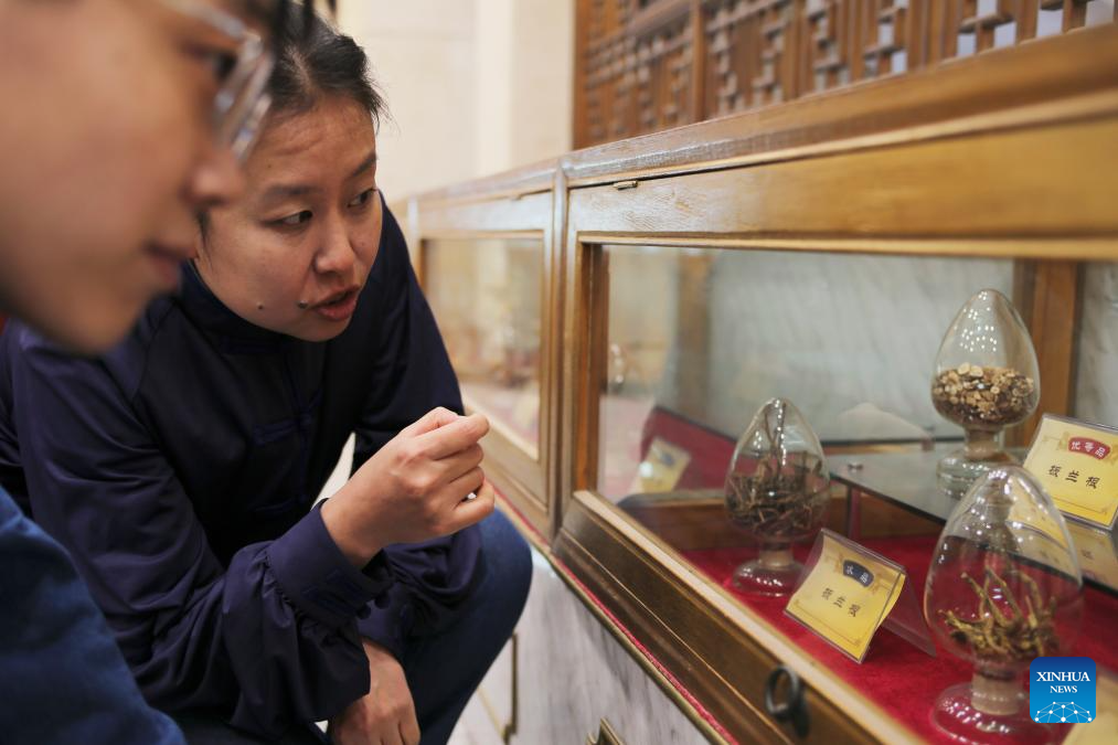 Pharmacist Li Ning (rear) introduces to her apprentice the Chinese herbal medicine displayed at the Yizhuang branch of Tong Ren Tang Technologies Co., Ltd. in Beijing, capital of China, Feb. 25, 2025. (Xinhua/Zhu Weixi)