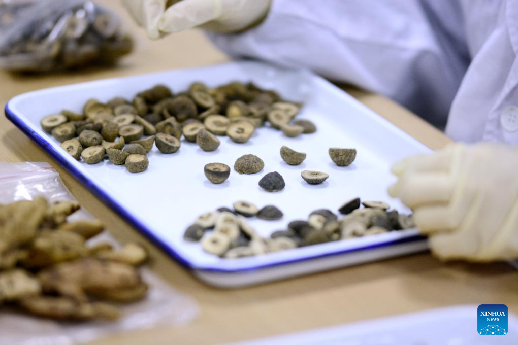 Guo Zhaohui, an expert for Chinese herbal medicine identification of Tong Ren Tang, checks medicine material in Beijing, capital of China, Feb. 23, 2025. (Xinhua/Li Xin)