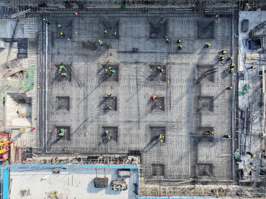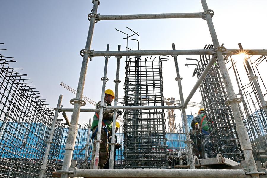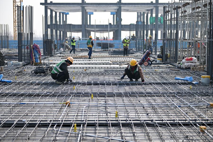 Staff members of China Construction Third Engineering Bureau Group Co., Ltd. work at the construction site of the headquarters of China Mineral Resources Group Ltd. (CMRG) in Xiong'an New Area, north China's Hebei Province, Feb. 27, 2025. (Xinhua/Mu Yu)