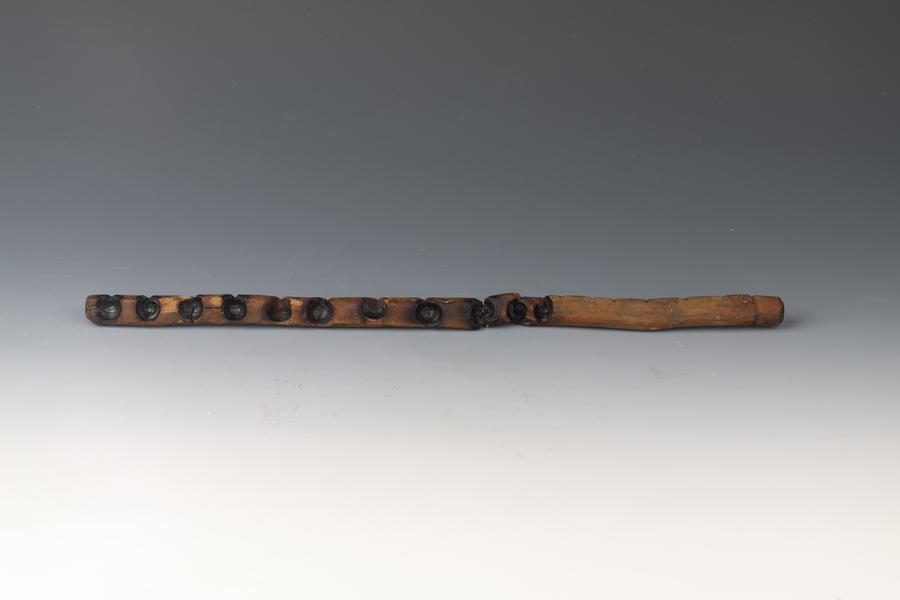 The drill stick measures over 60 centimeters in length, while the fireboard is over 30 centimeters long. The brown artifact has over 10 deep black circular indentations on its surface, showing clear signs of scorching.