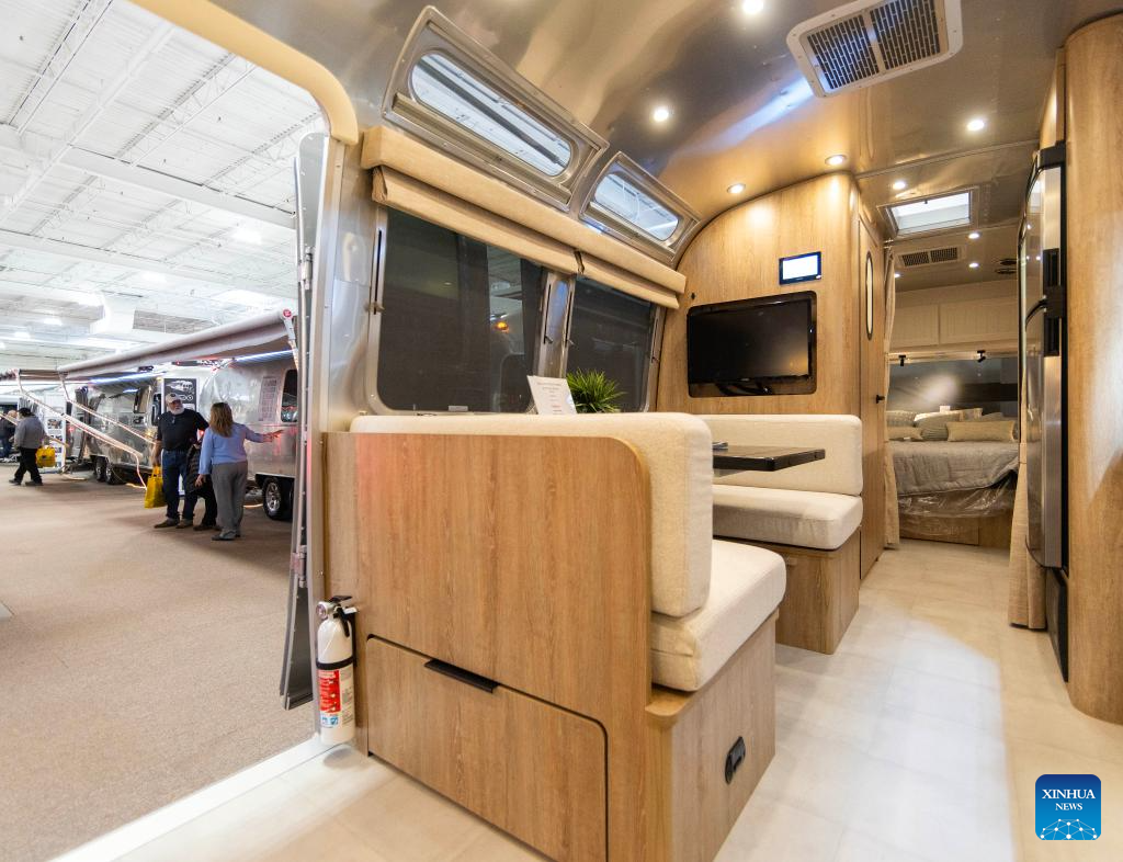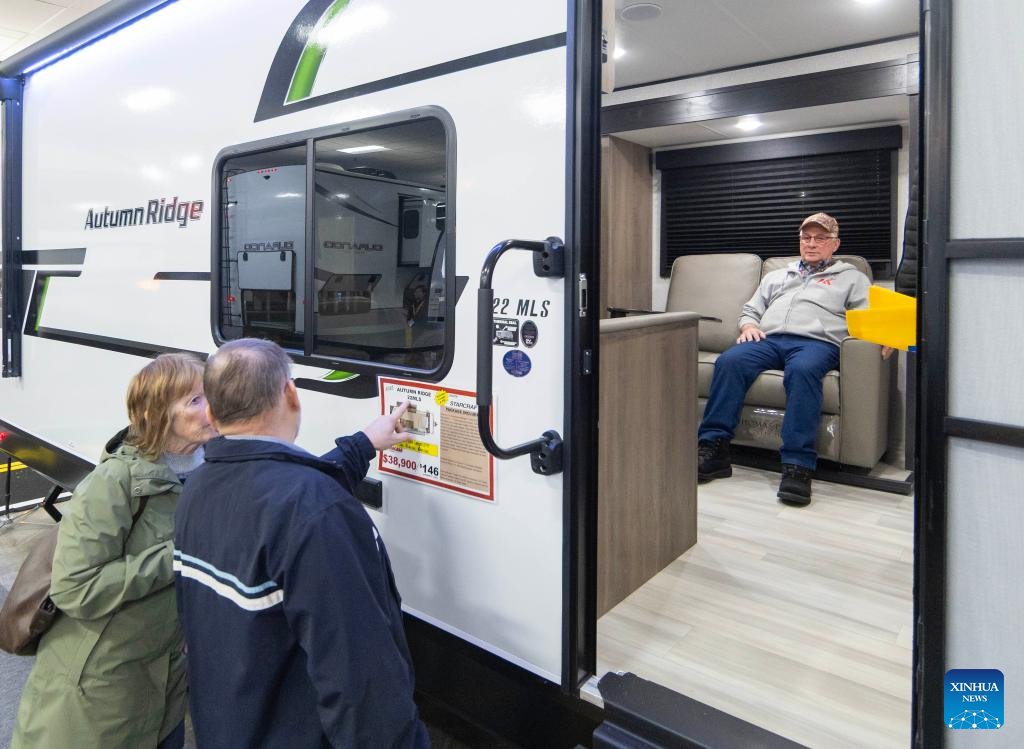 People view a travel trailer during the 2025 Toronto Spring Camping and RV Show in Mississauga, the Greater Toronto Area, Canada, on Feb. 27, 2025. Showcasing more than 450 RVs, this annual show kicked off here on Thursday and will last until March 2. (Photo by Zou Zheng/Xinhua)