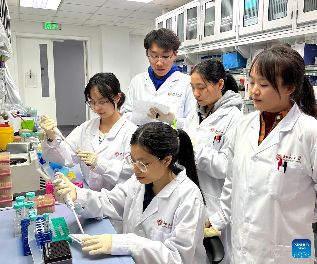 A research team of Peking University (PKU) conducts research of tumor cachexia in a laboratory at PKU in Beijing, capital of China, on March 29, 2024. (PKU/Handout via Xinhua)