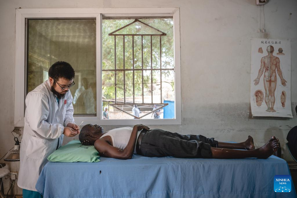 Gu Shaofei, a doctor of traditional Chinese medicine of the 12th batch of Chinese medical team to South Sudan, conducts acupuncture treatment to a patient at the Juba Teaching Hospital in Juba, South Sudan, on Feb. 26, 2025. Members on the 12th batch of Chinese medical team to South Sudan have been performing medication and education duties at local institutions including the Juba Teaching Hospital, the Juba Health Sciences Institute and the University of Juba since they arrived on Sept. 4, 2024. They had treated 7,124 outpatients and performed 81 surgical operations by Feb. 24, 2025. (Xinhua/Wang Guansen)