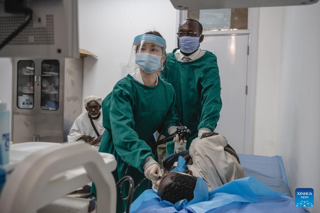 Ding Yun (front), a gastroenterologist of the 12th batch of Chinese medical team to South Sudan, conducts a gastroscopy on a patient at the Juba Teaching Hospital in Juba, South Sudan, on Feb. 26, 2025. Members on the 12th batch of Chinese medical team to South Sudan have been performing medication and education duties at local institutions including the Juba Teaching Hospital, the Juba Health Sciences Institute and the University of Juba since they arrived on Sept. 4, 2024. They had treated 7,124 outpatients and performed 81 surgical operations by Feb. 24, 2025. (Xinhua/Wang Guansen)
