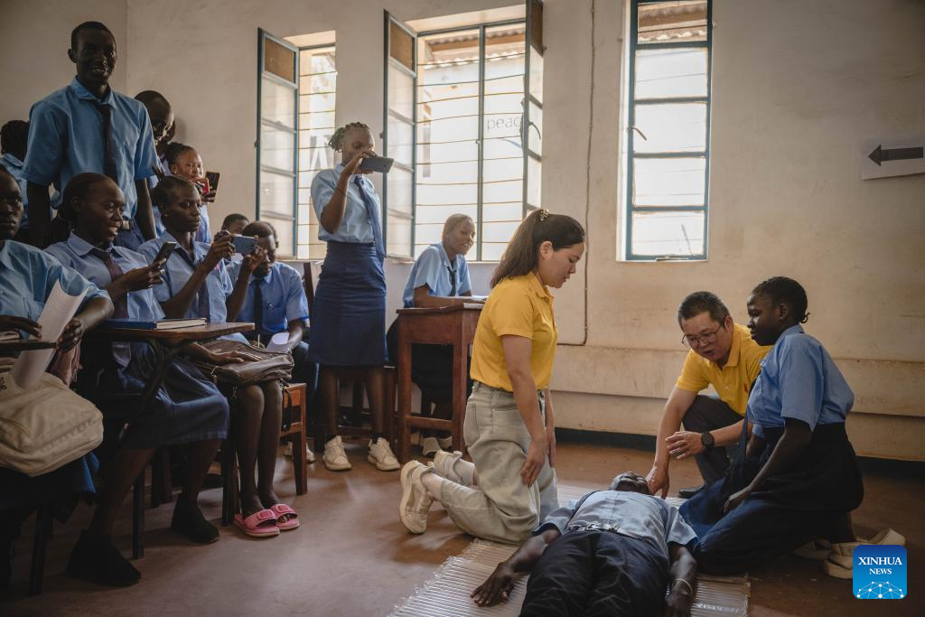 Anesthesiologist Zhou Tao (2nd R) and operation room nurse Ruan Shuqin (3rd R), both from the 12th batch of Chinese medical team to South Sudan, instruct students on CPR at the Juba Health Sciences Institute in Juba, South Sudan, on Feb. 25, 2025. Members on the 12th batch of Chinese medical team to South Sudan have been performing medication and education duties at local institutions including the Juba Teaching Hospital, the Juba Health Sciences Institute and the University of Juba since they arrived on Sept. 4, 2024. They had treated 7,124 outpatients and performed 81 surgical operations by Feb. 24, 2025. (Xinhua/Wang Guansen)