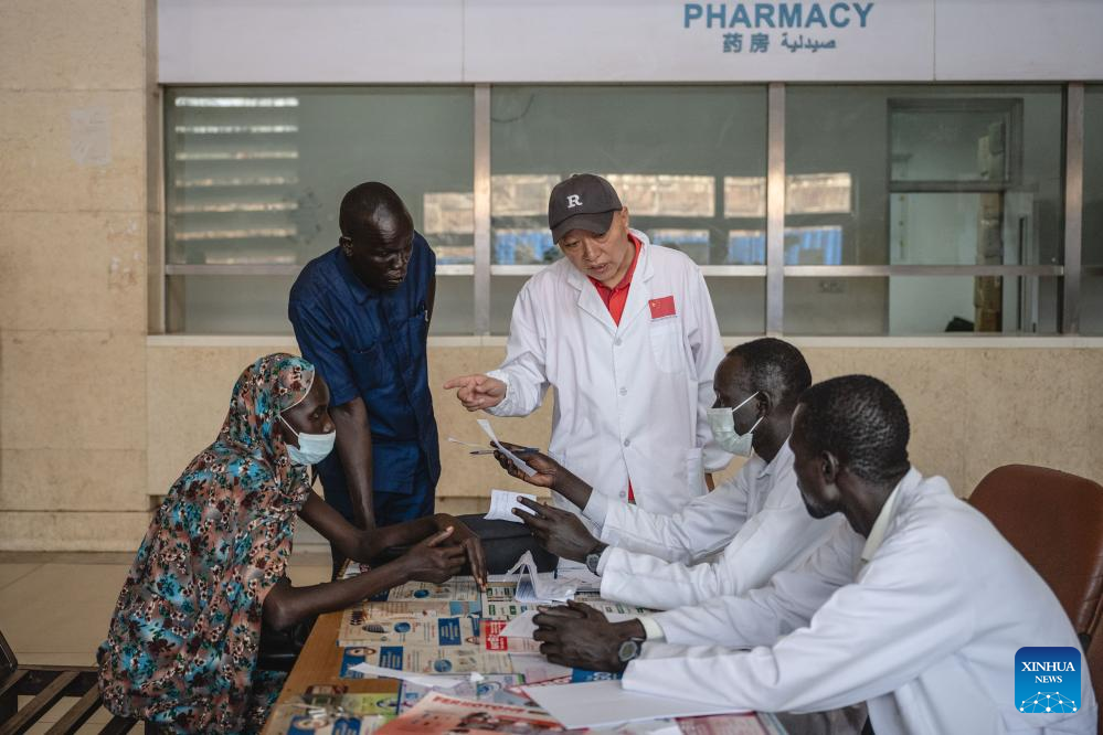Du Changyong (C), head of the 12th batch of Chinese medical team to South Sudan, communicates with local doctors at the Juba Teaching Hospital in Juba, South Sudan, on Feb. 26, 2025. Members on the 12th batch of Chinese medical team to South Sudan have been performing medication and education duties at local institutions including the Juba Teaching Hospital, the Juba Health Sciences Institute and the University of Juba since they arrived on Sept. 4, 2024. They had treated 7,124 outpatients and performed 81 surgical operations by Feb. 24, 2025. (Xinhua/Wang Guansen)