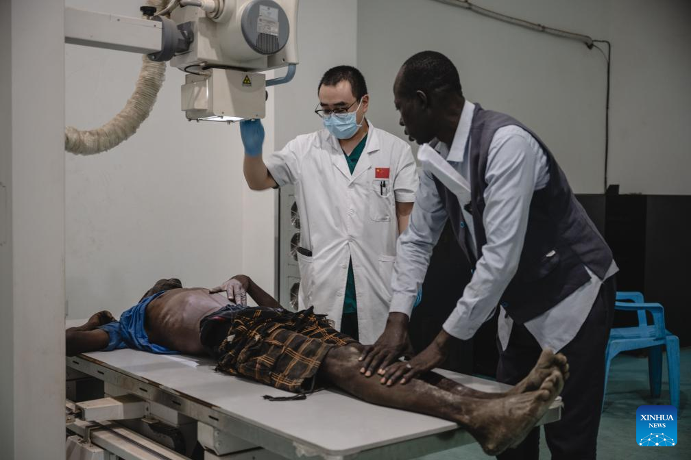 Liang Ce (L), a radiologist of the 12th batch of Chinese medical team to South Sudan, conducts the X-ray examination on a patient at the Juba Teaching Hospital in Juba, the capital of South Sudan, on Feb. 26, 2025. Members on the 12th batch of Chinese medical team to South Sudan have been performing medication and education duties at local institutions including the Juba Teaching Hospital, the Juba Health Sciences Institute and the University of Juba since they arrived on Sept. 4, 2024. They had treated 7,124 outpatients and performed 81 surgical operations by Feb. 24, 2025. (Xinhua/Wang Guansen)