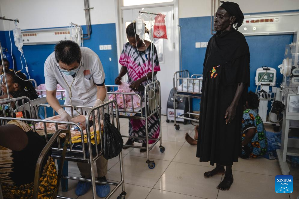 A pediatrician of the 12th batch of Chinese medical team to South Sudan performs a checkup on an infant at the newborn ward of the Juba Teaching Hospital in Juba, South Sudan, on Feb. 26, 2025. Members on the 12th batch of Chinese medical team to South Sudan have been performing medication and education duties at local institutions including the Juba Teaching Hospital, the Juba Health Sciences Institute and the University of Juba since they arrived on Sept. 4, 2024. They had treated 7,124 outpatients and performed 81 surgical operations by Feb. 24, 2025. (Xinhua/Wang Guansen)