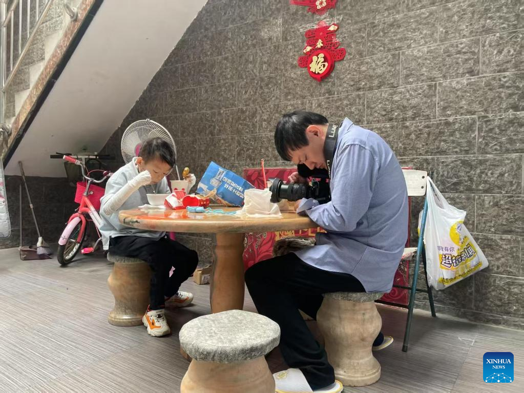 Wang Zichao (R) shoots a documentary about a patient suffering from hereditary epidermolysis bullosa in Changzhi City, north China's Shanxi Province, Oct. 12, 2024. (Xinhua)