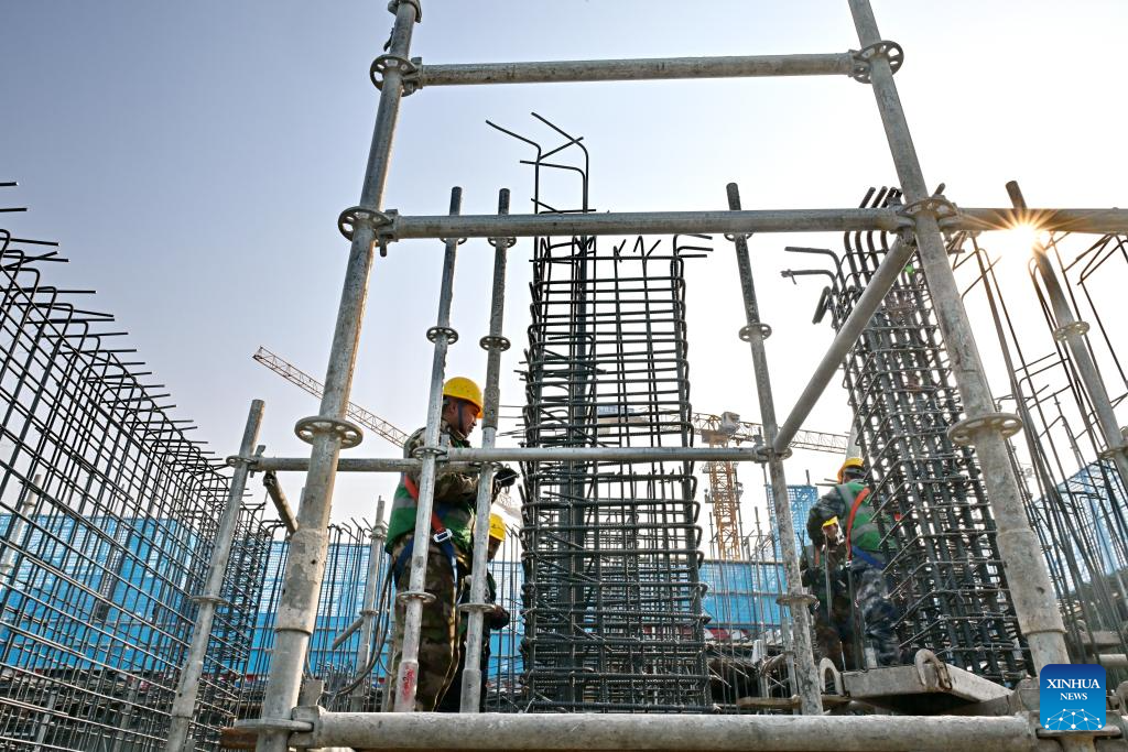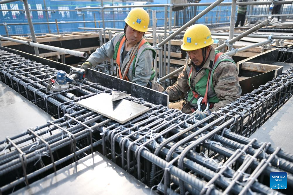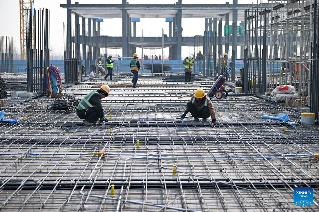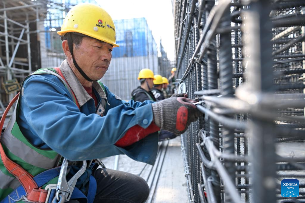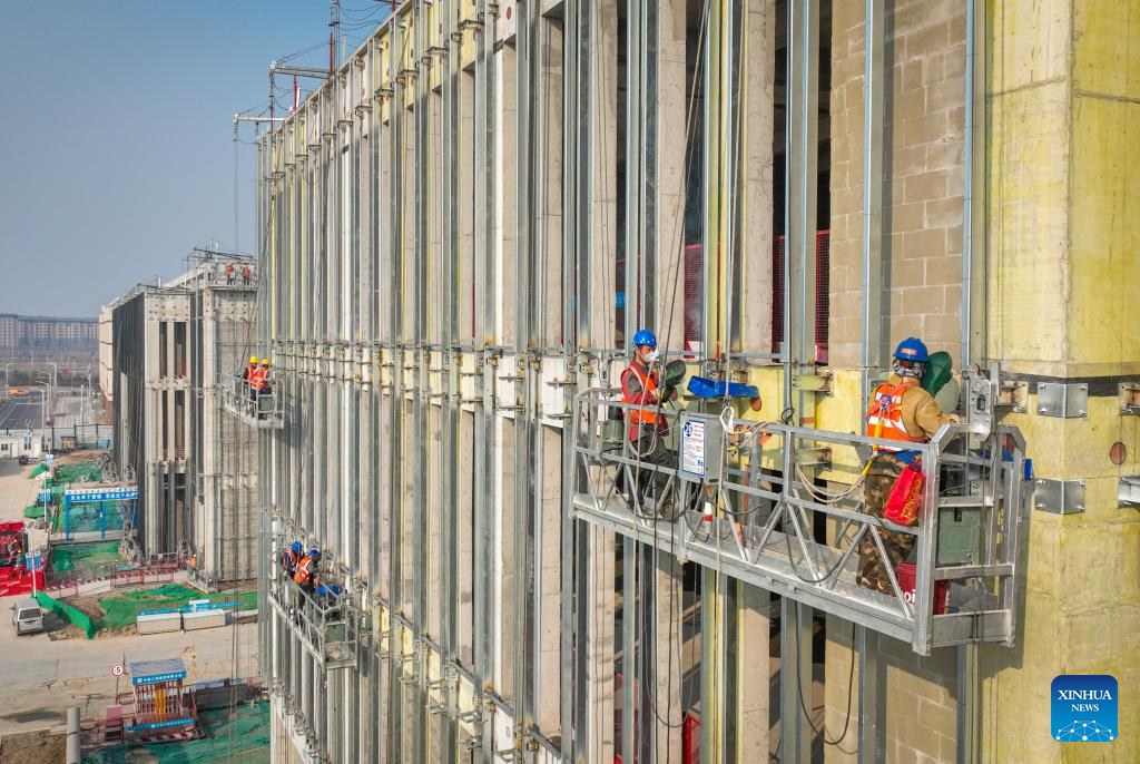 Staff members of China Construction Third Engineering Bureau Group Co., Ltd. work at the construction site of the headquarters of China Mineral Resources Group Ltd. (CMRG) in Xiong'an New Area, north China's Hebei Province, Feb. 27, 2025. Xiong'an New Area is pushing forward construction projects with top quality and high standards.