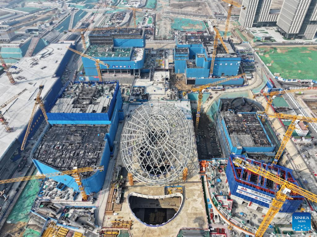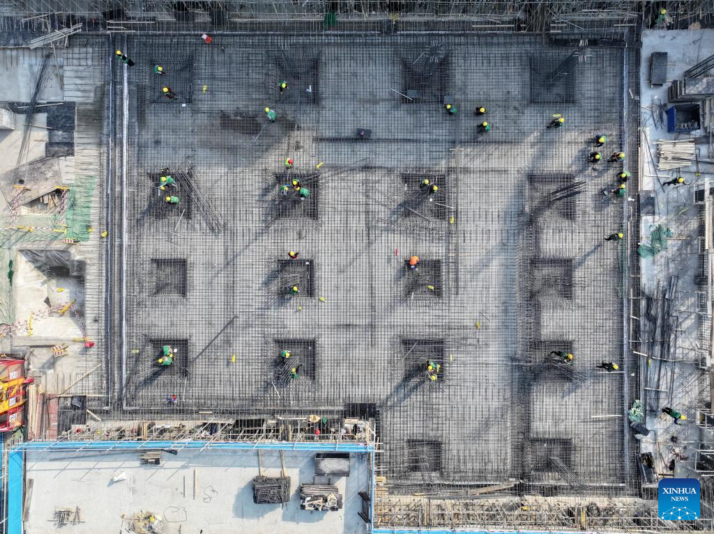A drone photo taken on Feb. 27, 2025 shows staff members of China Construction Third Engineering Bureau Group Co., Ltd. working at the construction site of Xiong'an Science and Technology Innovation Center in Xiong'an New Area, north China's Hebei Province. Xiong'an New Area is pushing forward construction projects with top quality and high standards.