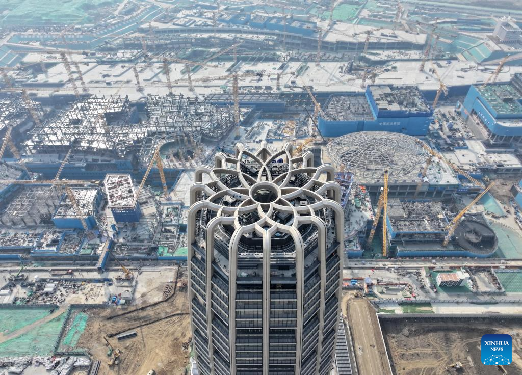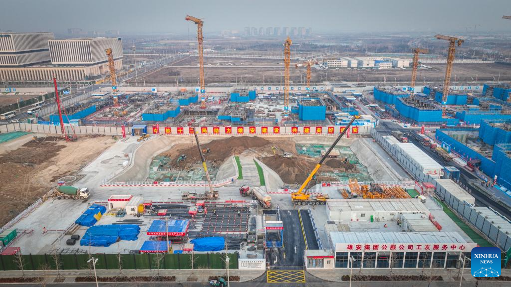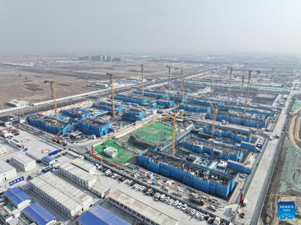 A drone photo taken on Feb. 27, 2025 shows the construction site of Xiong'an's Guomao area in north China's Hebei Province. Xiong'an New Area is pushing forward construction projects with top quality and high standards.