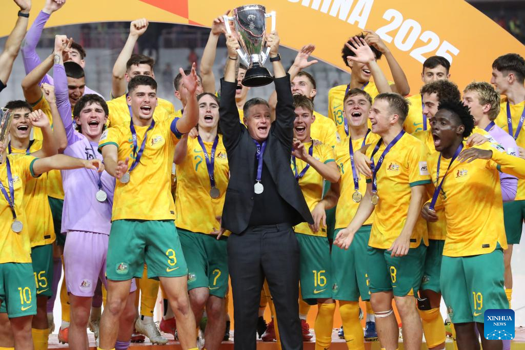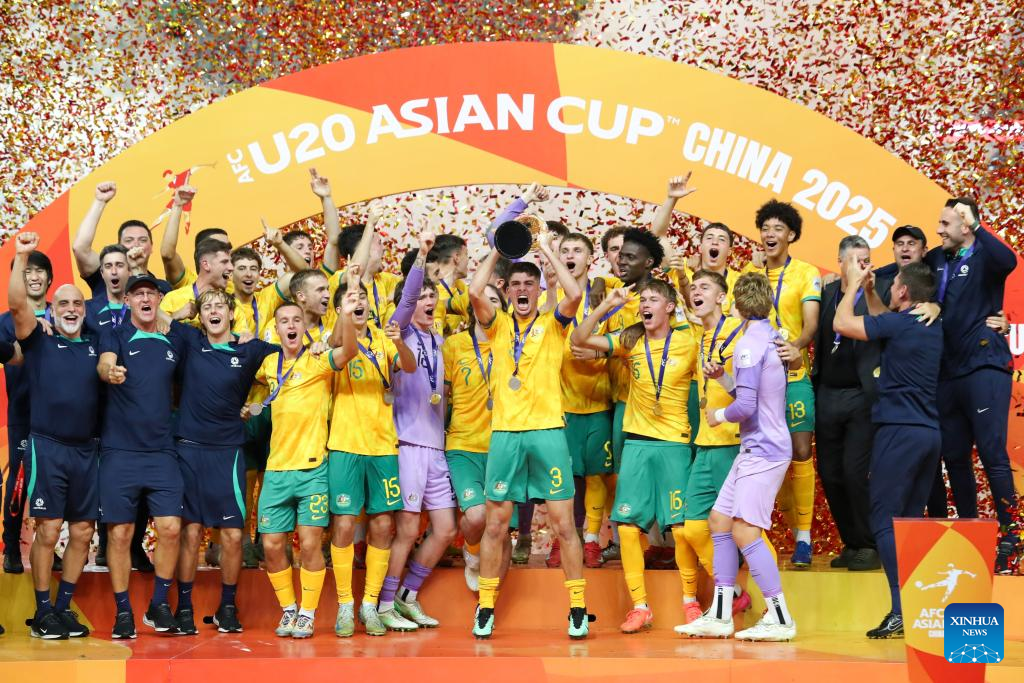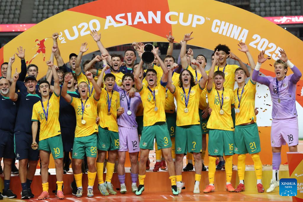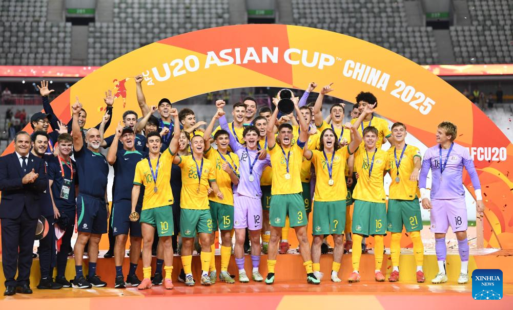 Team Australia celebrate during the awarding ceremony after the final between Australia and Saudi Arabia of AFC U20 Asian Cup football tournament in Shenzhen, south China's Guangdong Province, March 1, 2025. (Xinhua/Li Xulun)