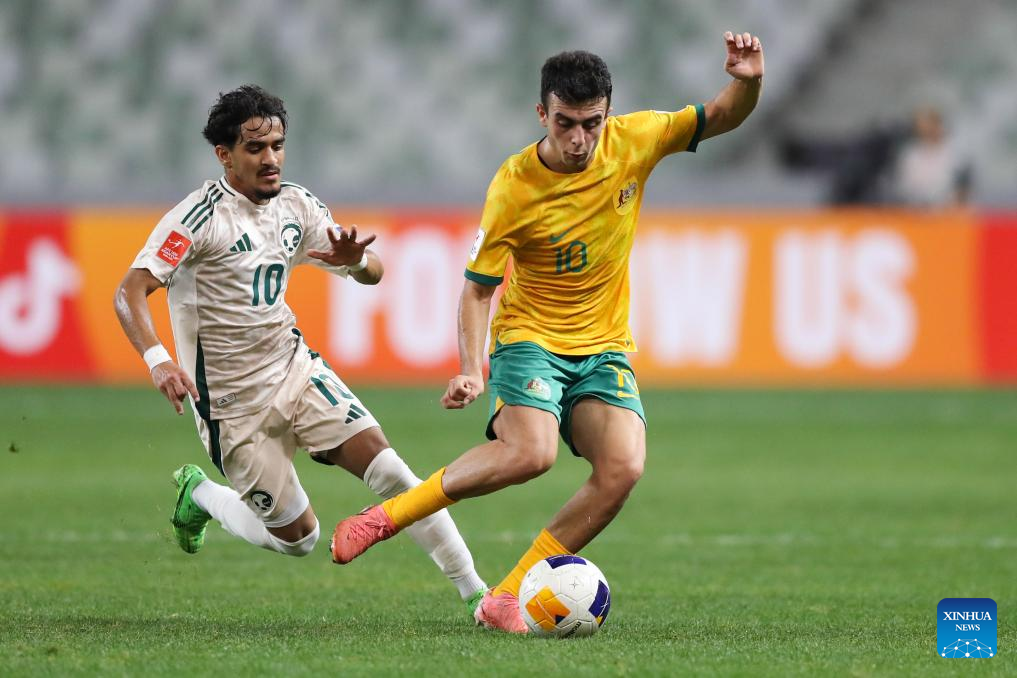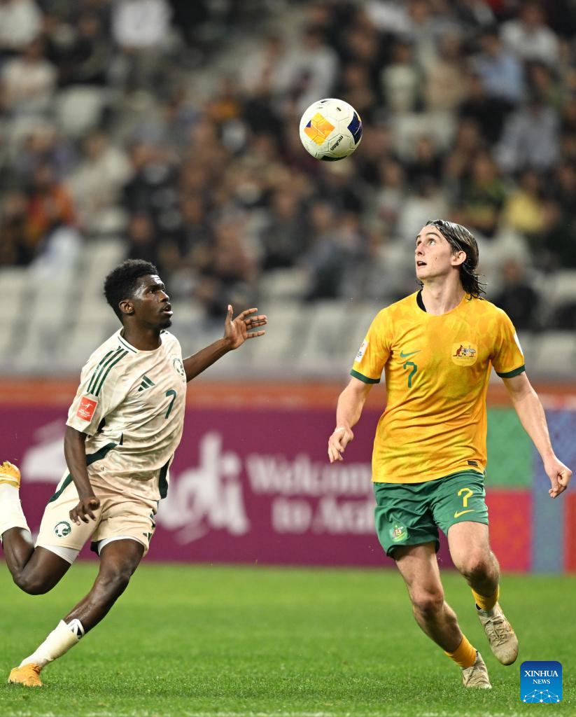 Alex Badolato (R) of Australia vies with Ziyad Abdullah Alghamdi of Saudi Arabia during the final at AFC U20 Asian Cup football tournament in Shenzhen, south China's Guangdong Province, March 1, 2025. (Xinhua/Li Xulun)