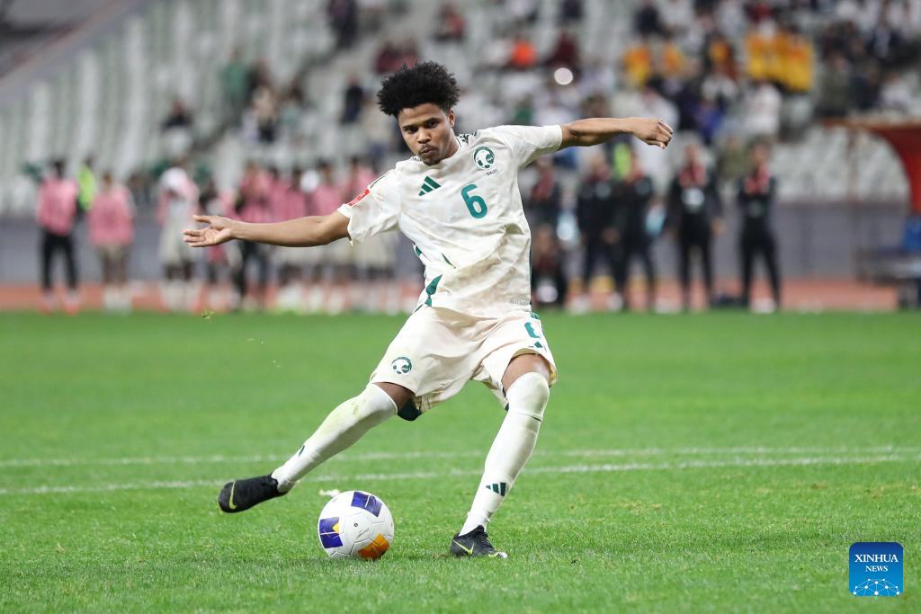 Saleh Ali Barnawi of Saudi Arabia kicks a penalty during the final between Australia and Saudi Arabia at AFC U20 Asian Cup football tournament in Shenzhen, south China's Guangdong Province, March 1, 2025. (Xinhua/Li Xulun)