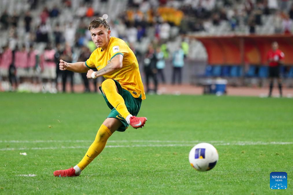 Luka Jovanovic of Australia shoots during the penalty shoot out of the final between Australia and Saudi Arabia of AFC U20 Asian Cup football tournament in Shenzhen, south China's Guangdong Province, March 1, 2025. (Xinhua/Li Xulun)