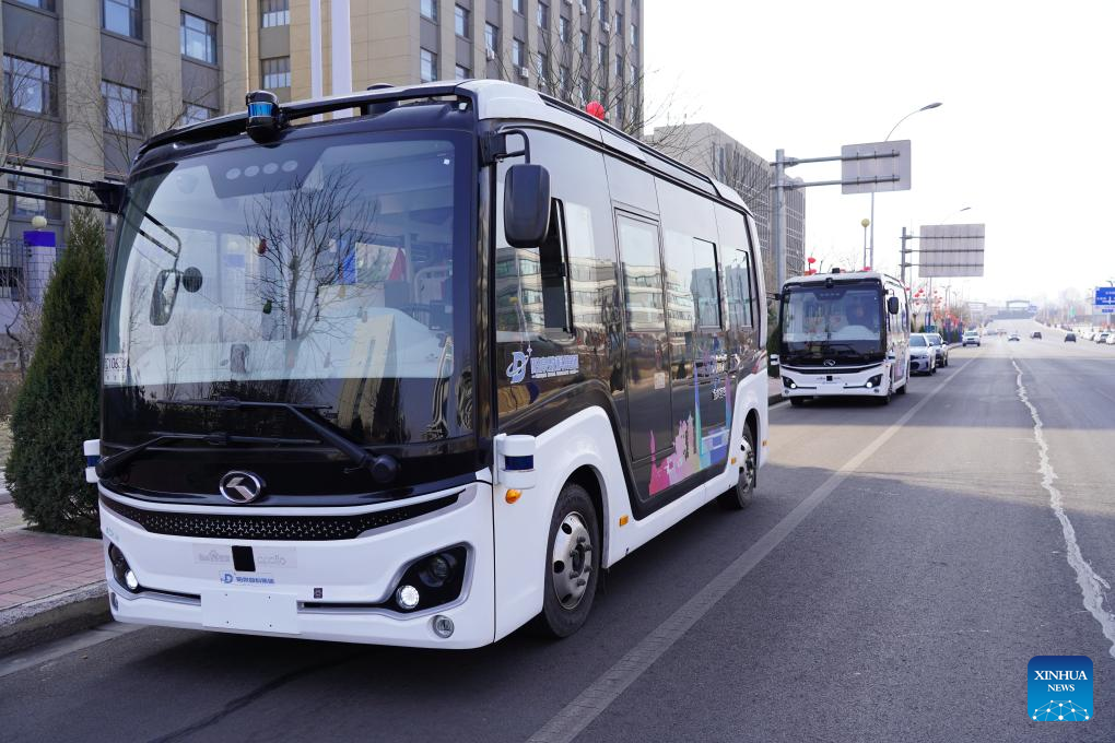 Autonomous driving buses are seen on a street in Yangquan, north China's Shanxi Province, Feb. 27, 2025. (Xinhua/Chen Zhihao)