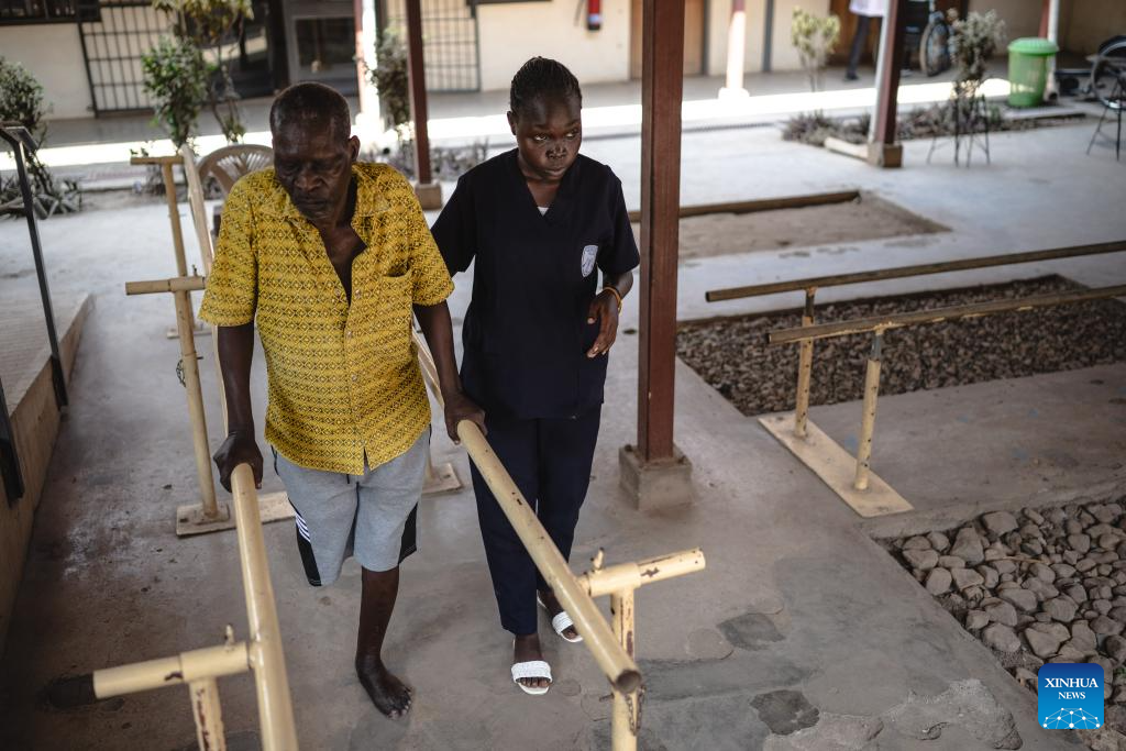 A nurse from the International Committee of the Red Cross (ICRC) South Sudan delegation assists a disabled refugee to rehabilitate at a physical rehabilitation center in Juba, the capital of South Sudan, on Feb. 28, 2025. The physical rehabilitation center currently accommodates over 30 individuals, aiming to assist refugees disabled by conflicts to regain their functions. (Xinhua/Wang Guansen)